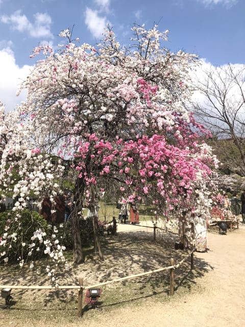 From late March, vibrant pink weeping cherry blossoms begin to bloom, followed by the pale pink Somei Yoshino and pure white Oshima cherry blossoms reaching their peak. A highlight of visiting during this period is the extended viewing opportunity as different varieties gradually reach full bloom, offering a spectrum of cherry blossom colors.