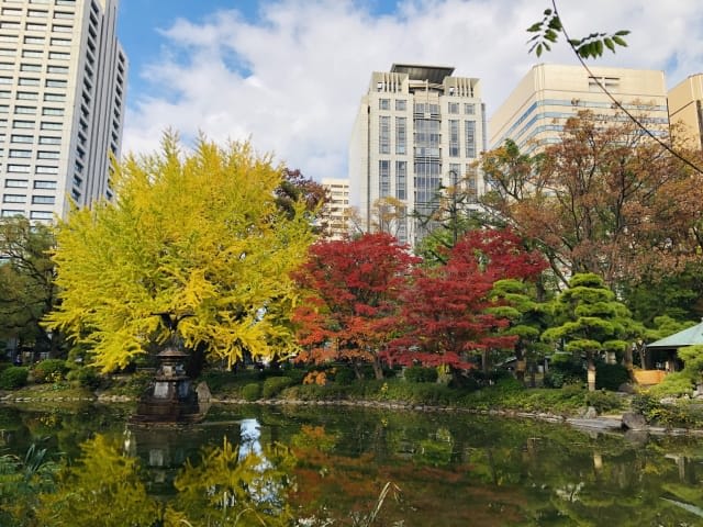 Additionally, Tokyo Bay seawater flows into Tide Pond, so you can sometimes observe marine creatures like eels and crabs. Try spending a peaceful autumn moment away from the city's hustle and bustle by carefully observing the pond or drinking matcha at the teahouse while viewing the autumn foliage.