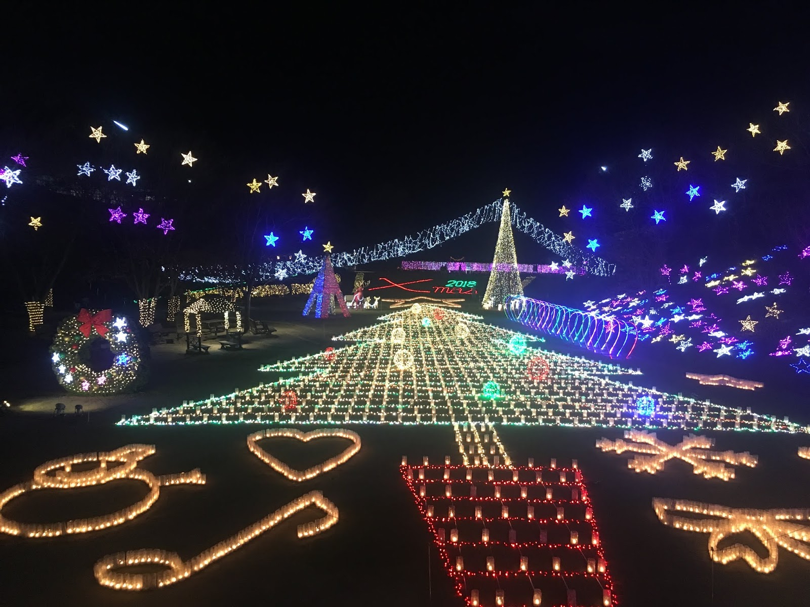 The characteristic feature of Winter Fireflies is that the illuminations are made from approximately 35,000 plastic bottles. Everything is handmade by dozens of local volunteers, and while small in scale, there are impressive works including a large Santa face, Christmas arches, and heart-shaped objects.