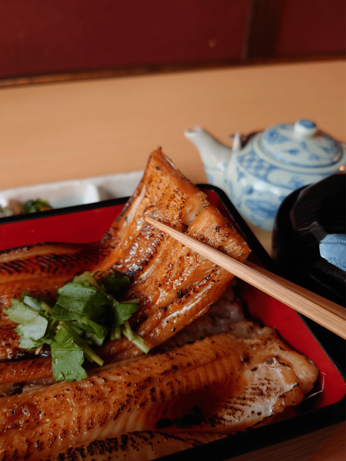 At Tsukiakari, guests first enjoy the sea eel on its own to savor its natural flavor, then experience the "Hitsumabushi" style by pouring Dashi — a broth made from fish and kelp — over the dish and eating it a second way.