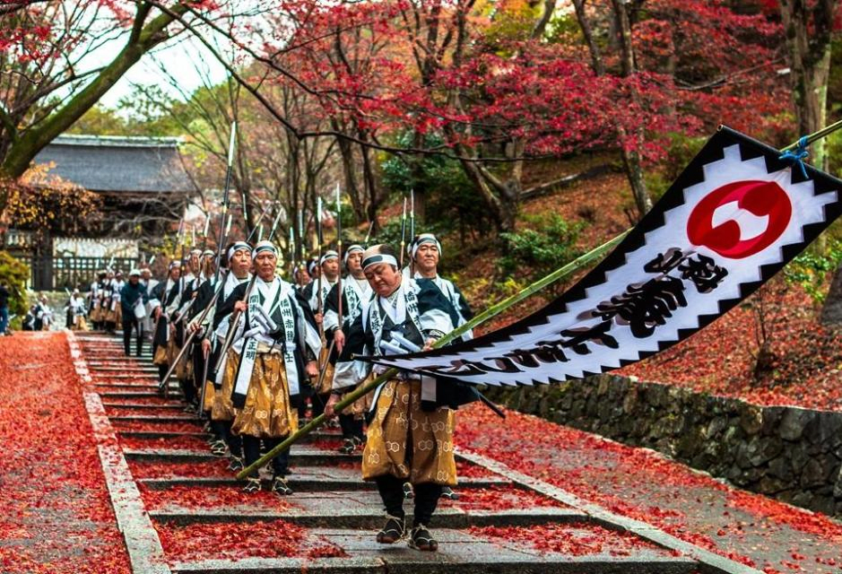The highlight of the event is the moment the samurai emerge from Bishamon-do Temple. Watching them descend the stone steps blanketed with fallen autumn leaves, you can truly feel the fierce spirit of these warriors.