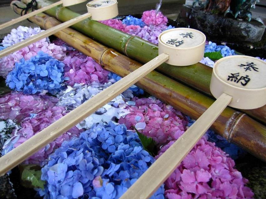 Additionally, at the temizusha, the ritual purification fountain where visitors cleanse their hands and mouth before worship, you can enjoy the charming sight of colorful hydrangeas floating in the water. Along with paying your respects at this sacred shrine, be sure to take your time admiring the hydrangeas that bloom so beautifully only during this special time of year.