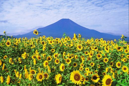 At Hana-no-Miyako Summer Breeze, set against the breathtaking backdrop of Mt. Fuji, visitors can enjoy a vast flower garden featuring one million zinnias, ten thousand impatiens, and one hundred fifty thousand sunflowers, among many other varieties of flowers.