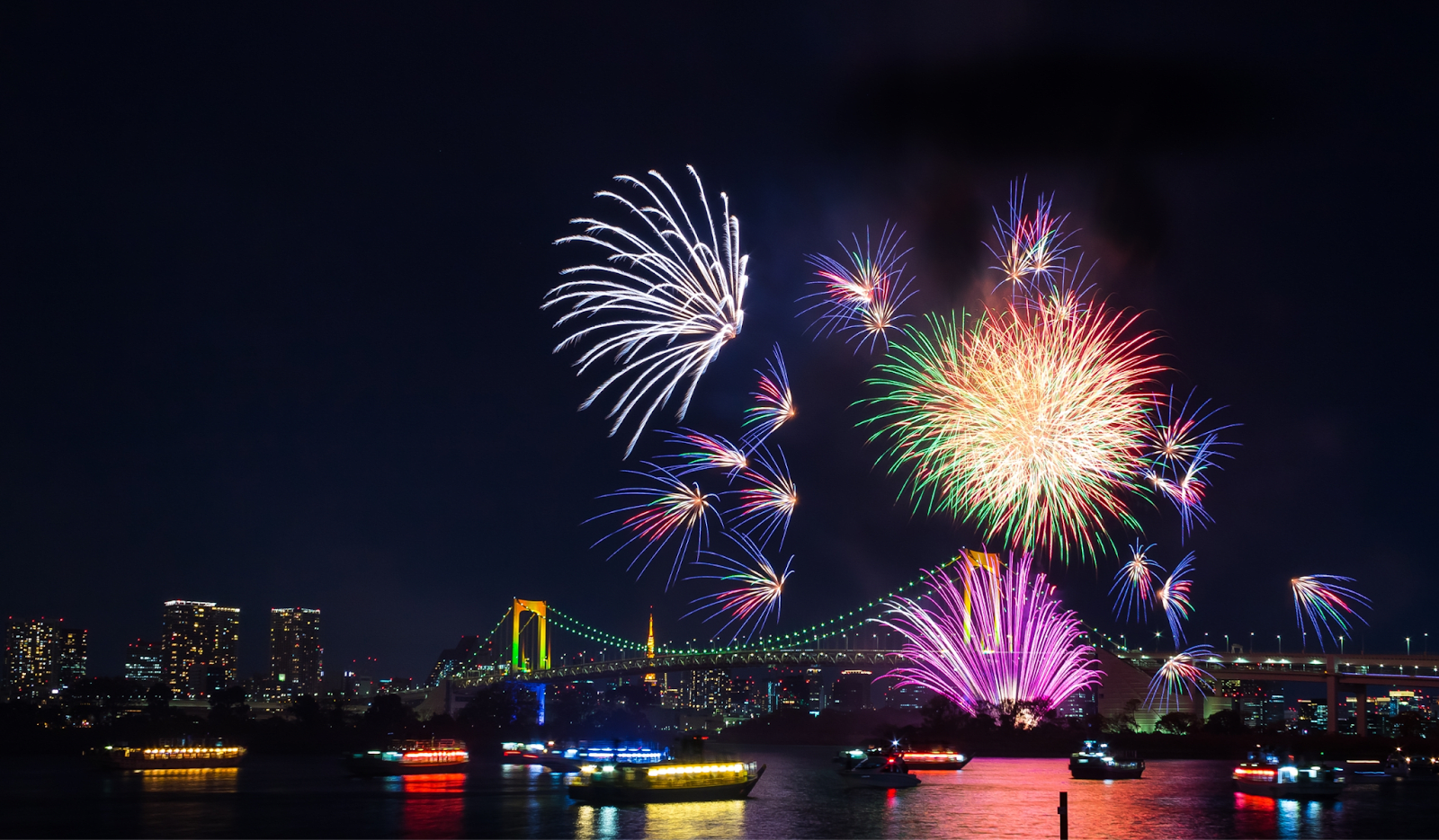One of the highlights of Odaiba Rainbow Fireworks is the stunning combination of fireworks against the backdrop of Rainbow Bridge and the glittering city skyline. The colorful display of light illuminating the night sky is truly breathtaking.
